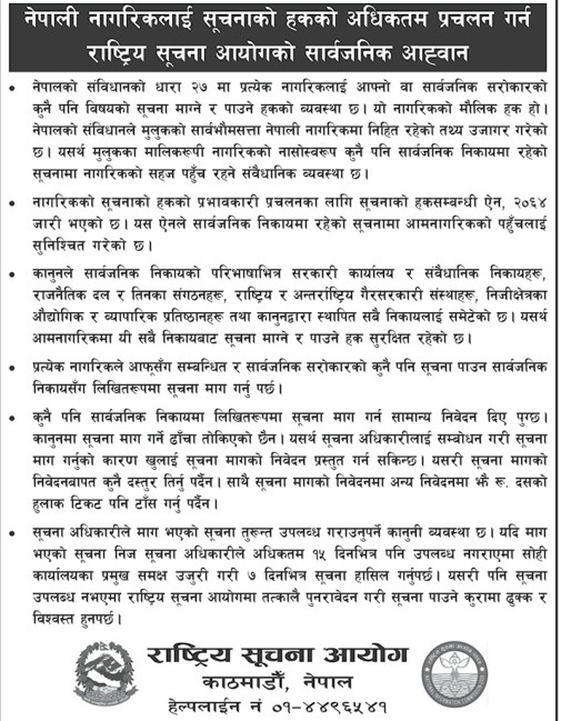 नेपाली नागरिकलाई सूचनाको हकको अधिकतम प्रचलन गर्न राष्ट्रिय सूचना आयोगको सार्वजनिक आह्वान